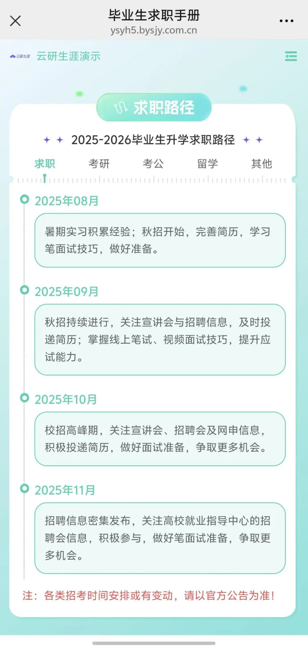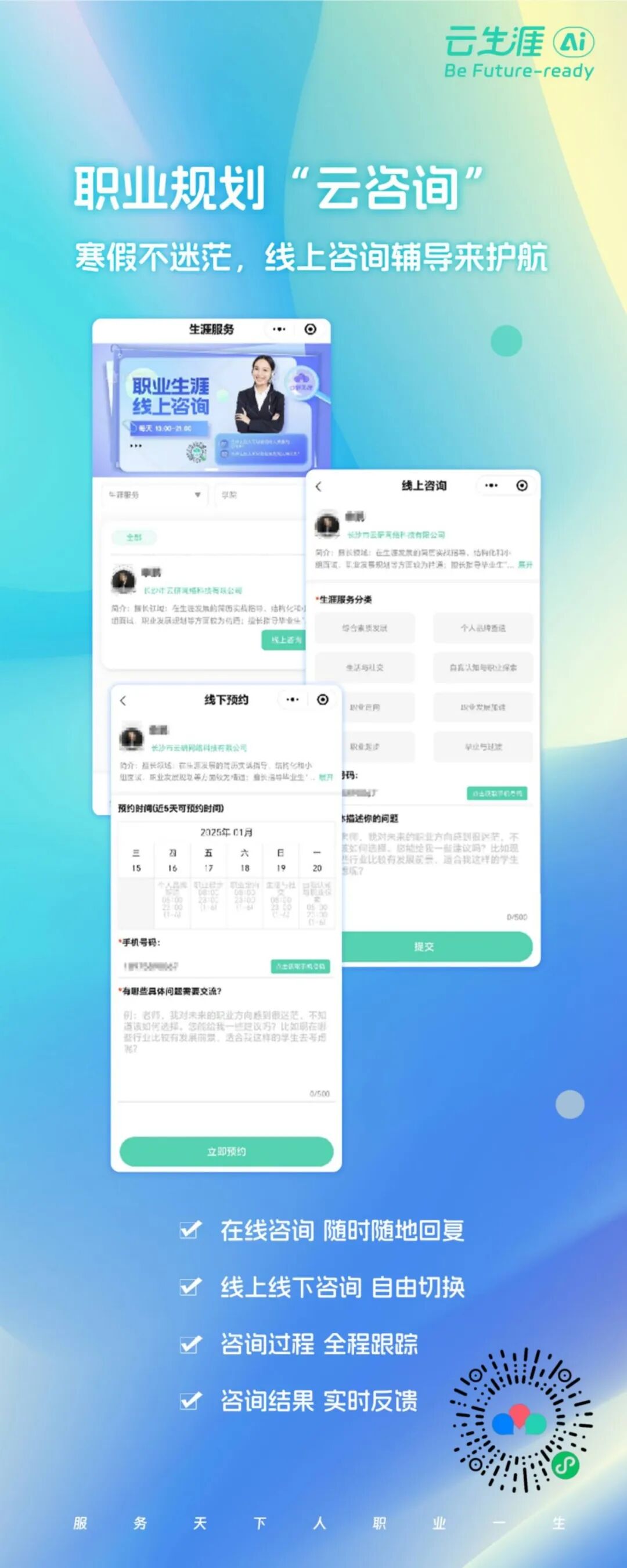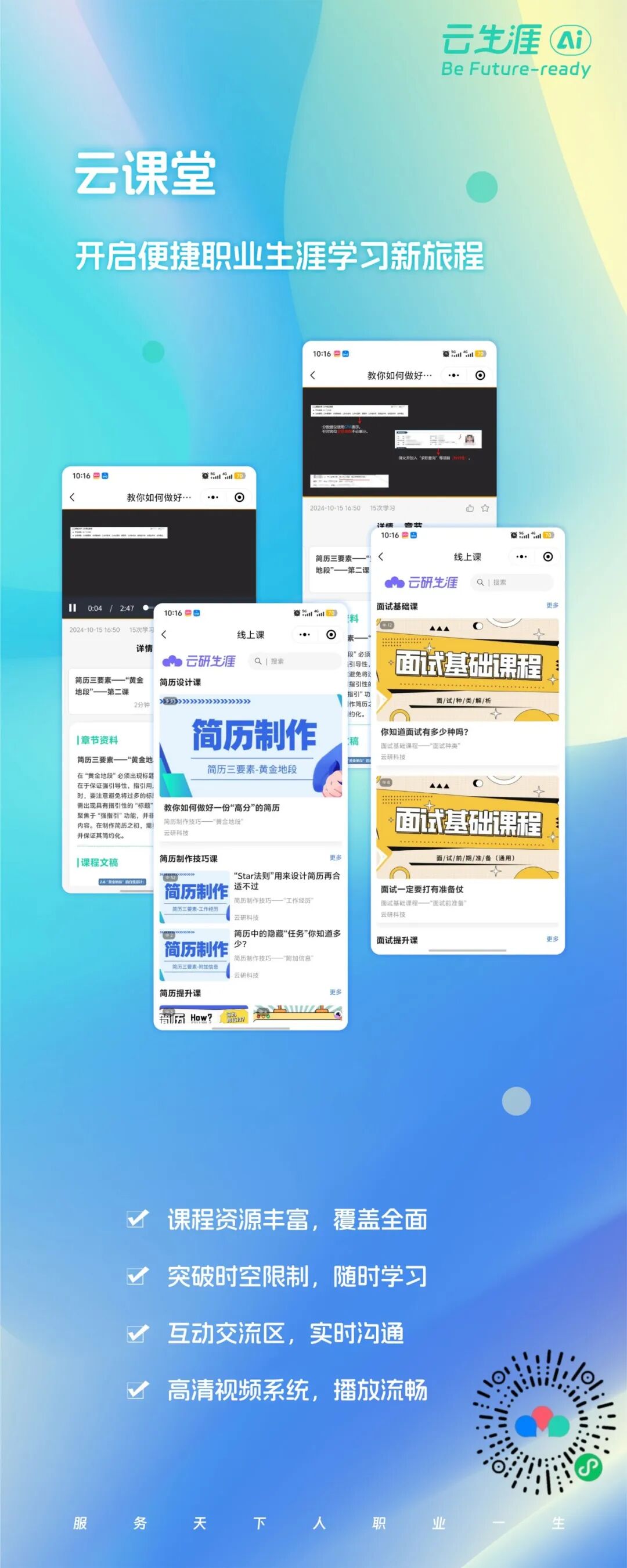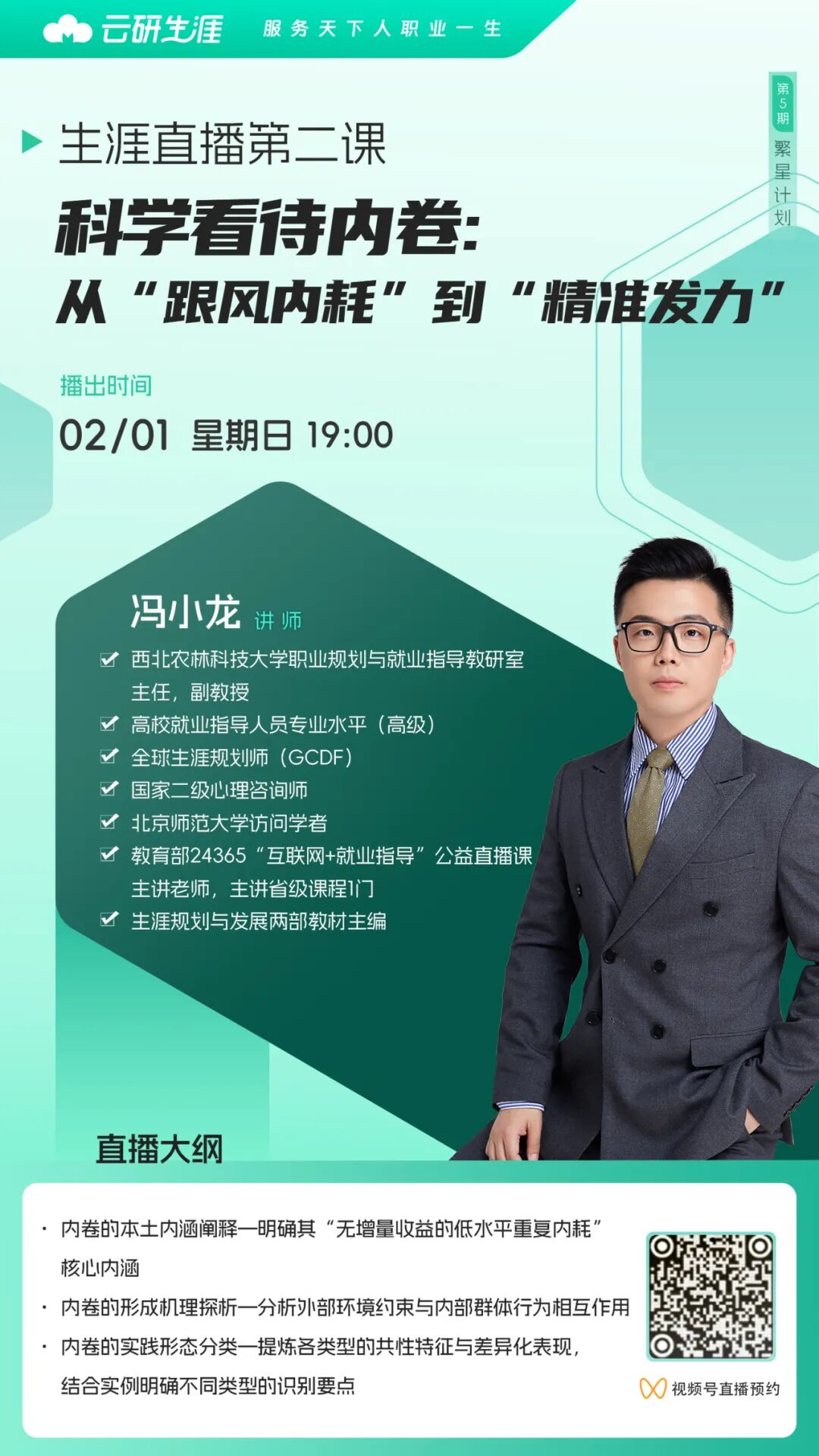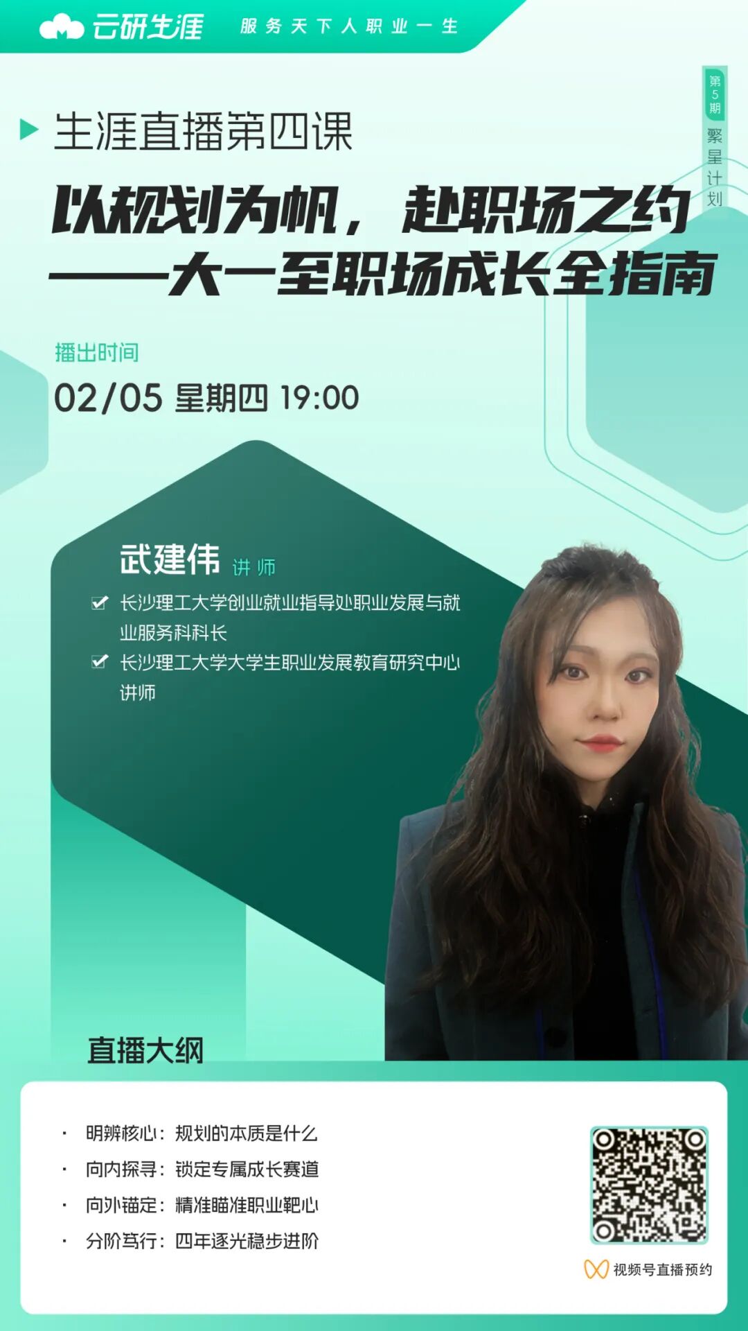 假期已至,我校精心联合云研生涯打造大学生生涯指导系列直播课程,为同学们量身定制从自我探索到职场落地的全链路职业成长方案,助力明晰生涯方向、锤炼求职硬实力,开启专属职业进阶之旅!课程以 “向内探索 - 向外锚定 - 分阶笃行 - 终身成长” 为核心底层逻辑,直击大学生生涯规划迷茫、求职准备无章法的核心痛点,践行从规划到发展、从指导到赋能、从计划到行动、从就业到生涯的四维培养理念,帮你跳出求职认知误区,构建专属职业发展框架。