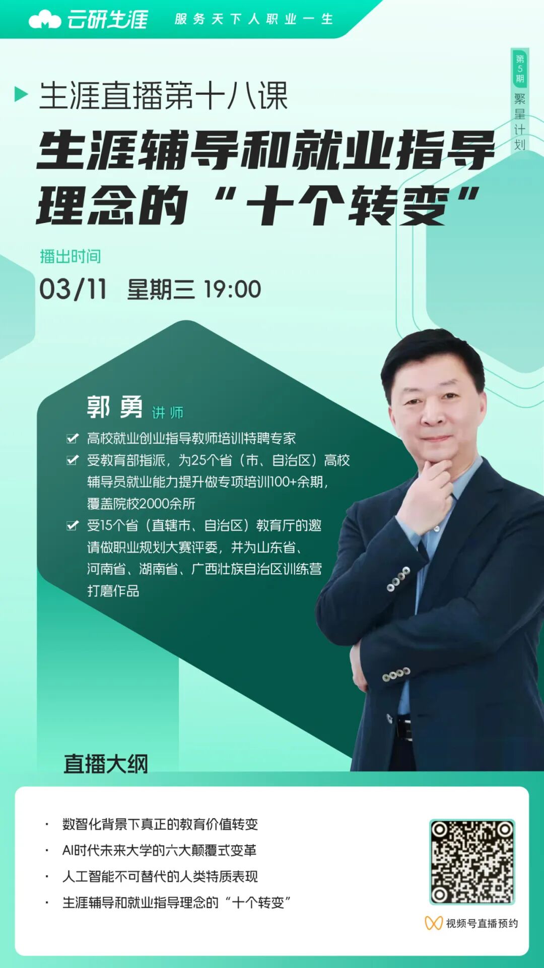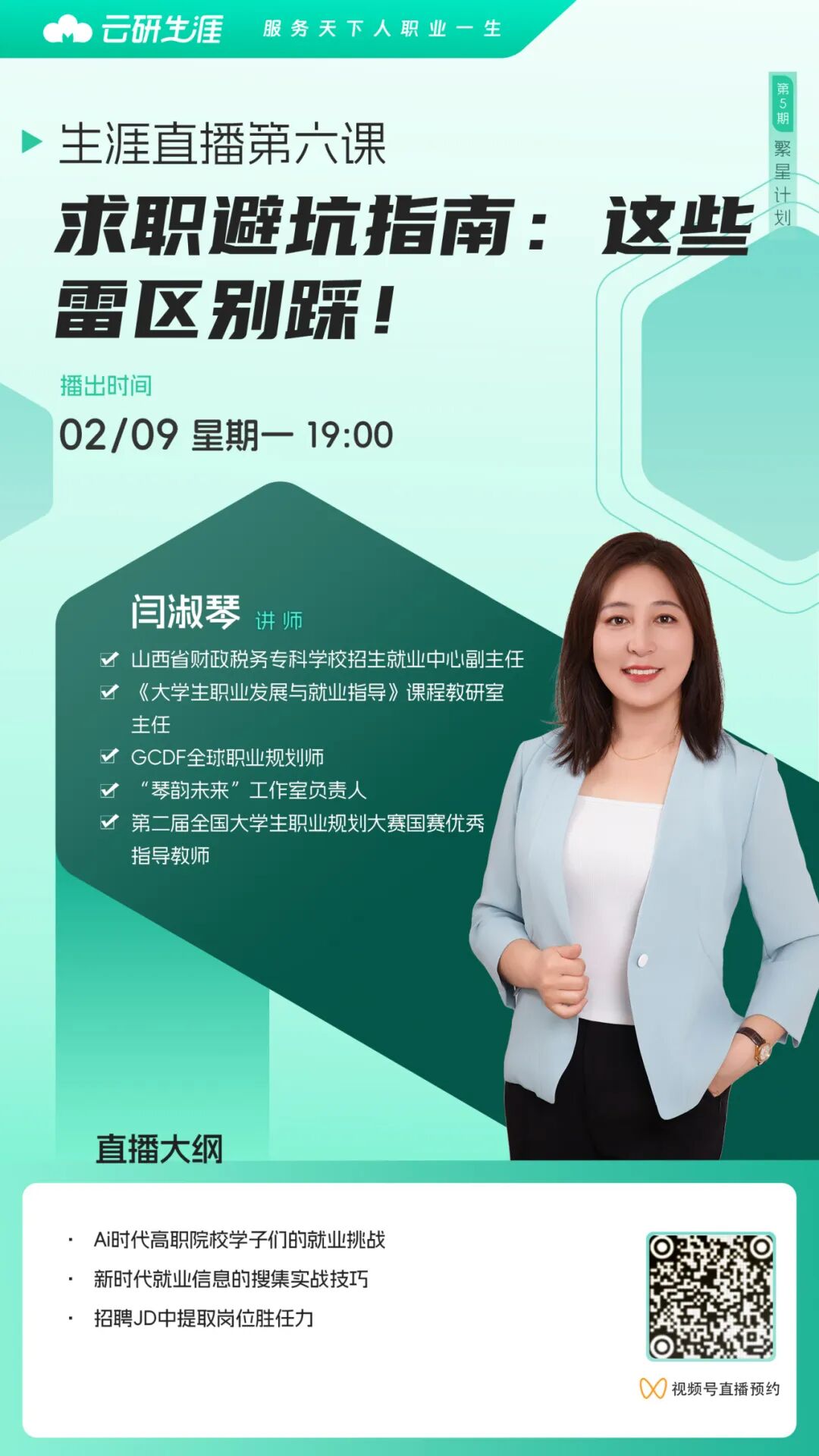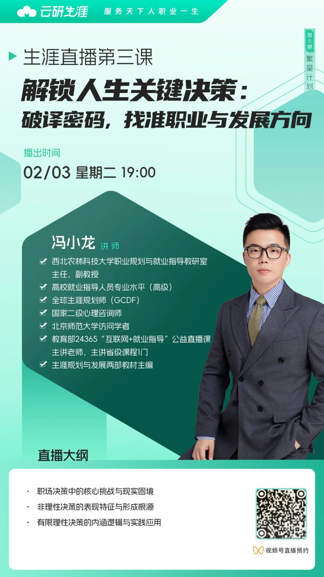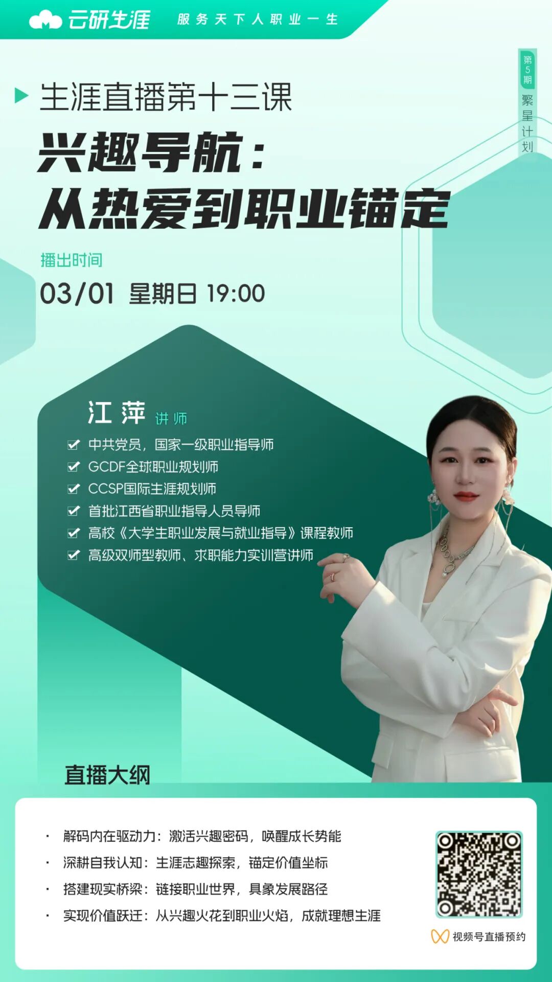 课程还融合朋辈经验分享与专业指导,以 “理论讲解 + 实战拆解 + 真实案例” 的三维教学模式,将生涯志趣探索、决策能力培养、职场竞争力提升落到实处。专业生涯指导师联袂行业资深导师倾力授课,全程干货满满、实操导向。锁定专属直播通道,抢先占位这场兼具理论深度与实操价值的生涯成长盛宴,为斩获理想 offer 蓄力,让生涯规划成为奔赴职业理想的坚实基石!
