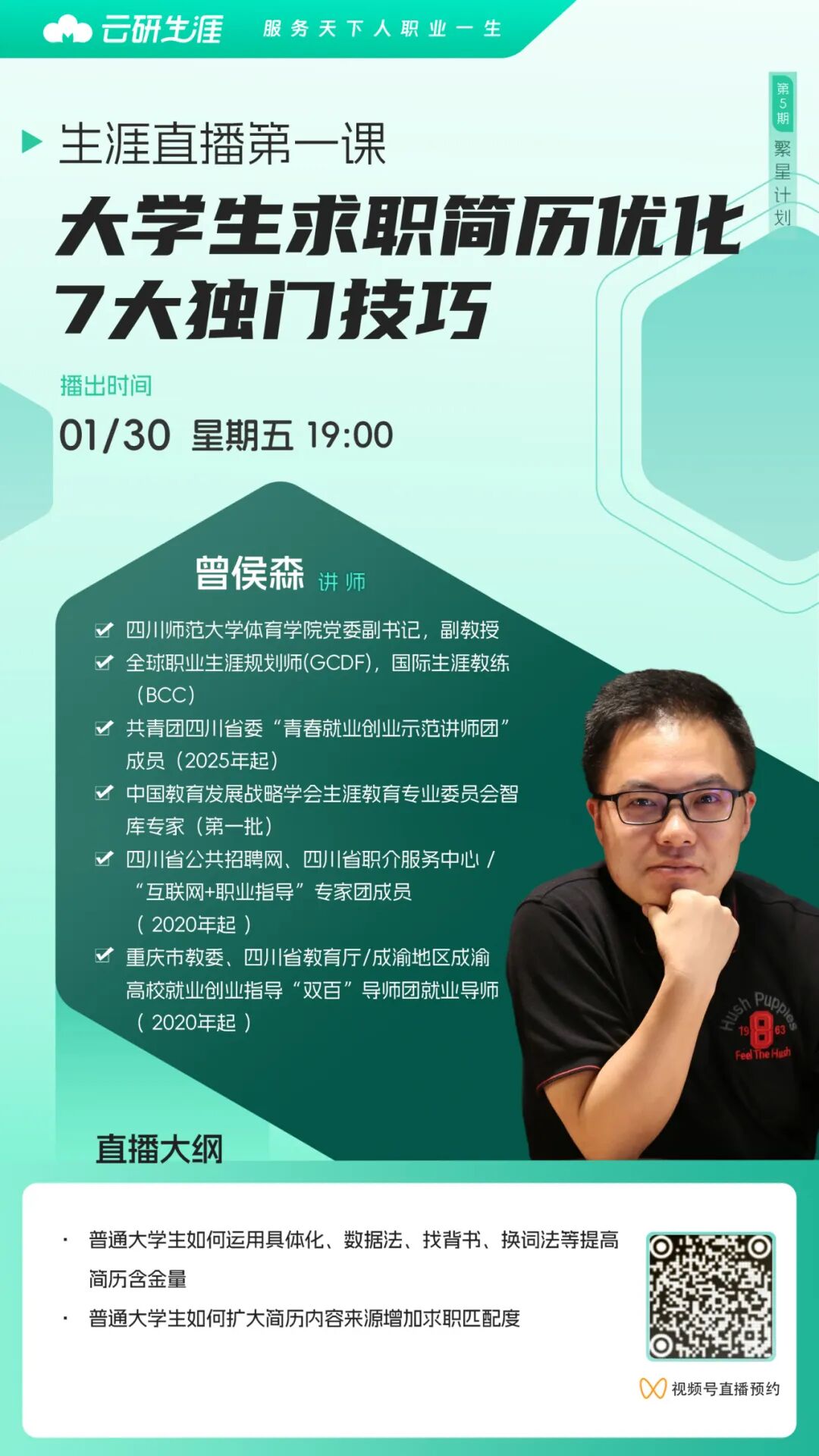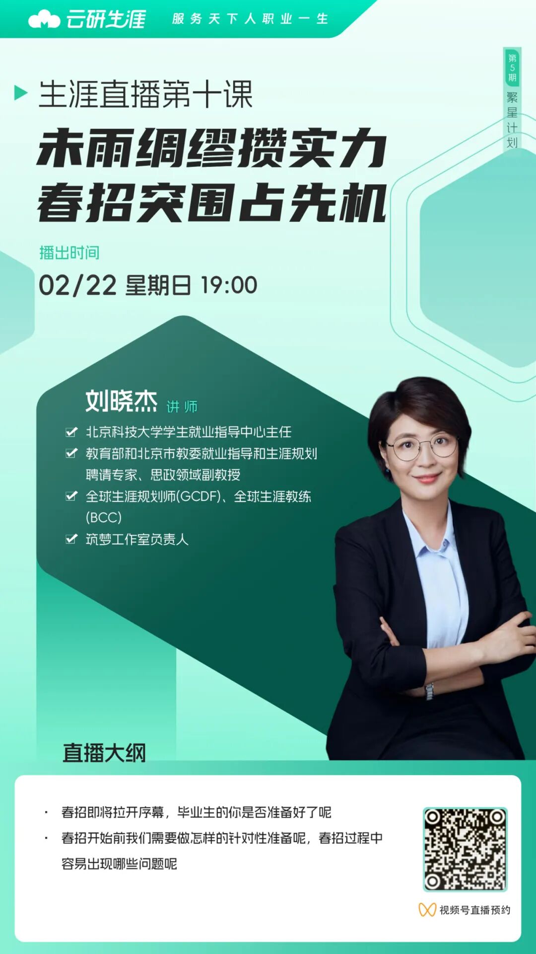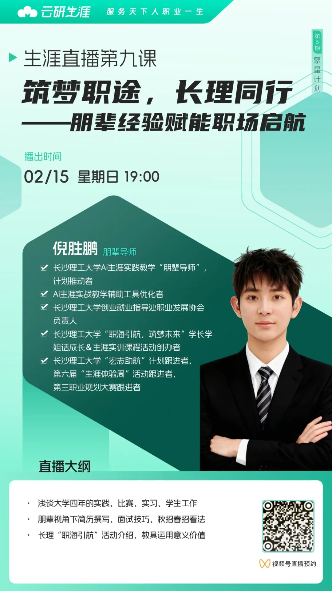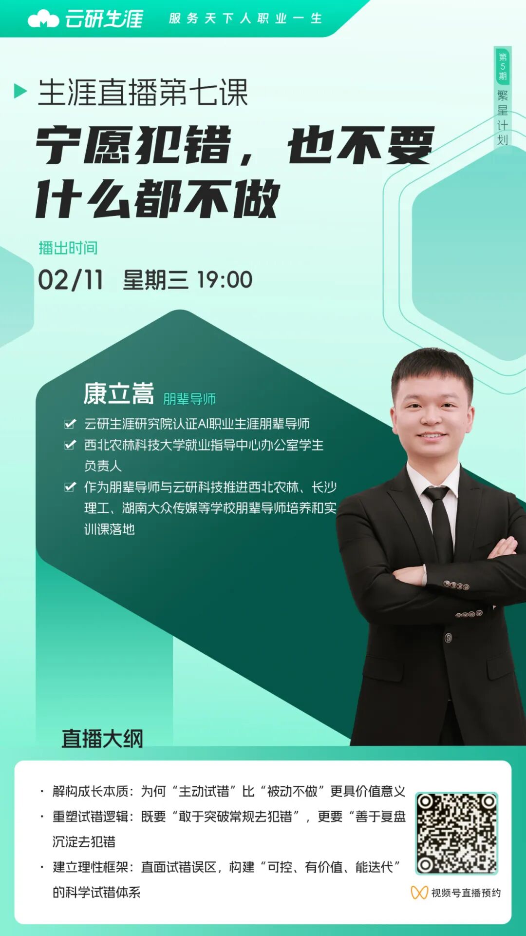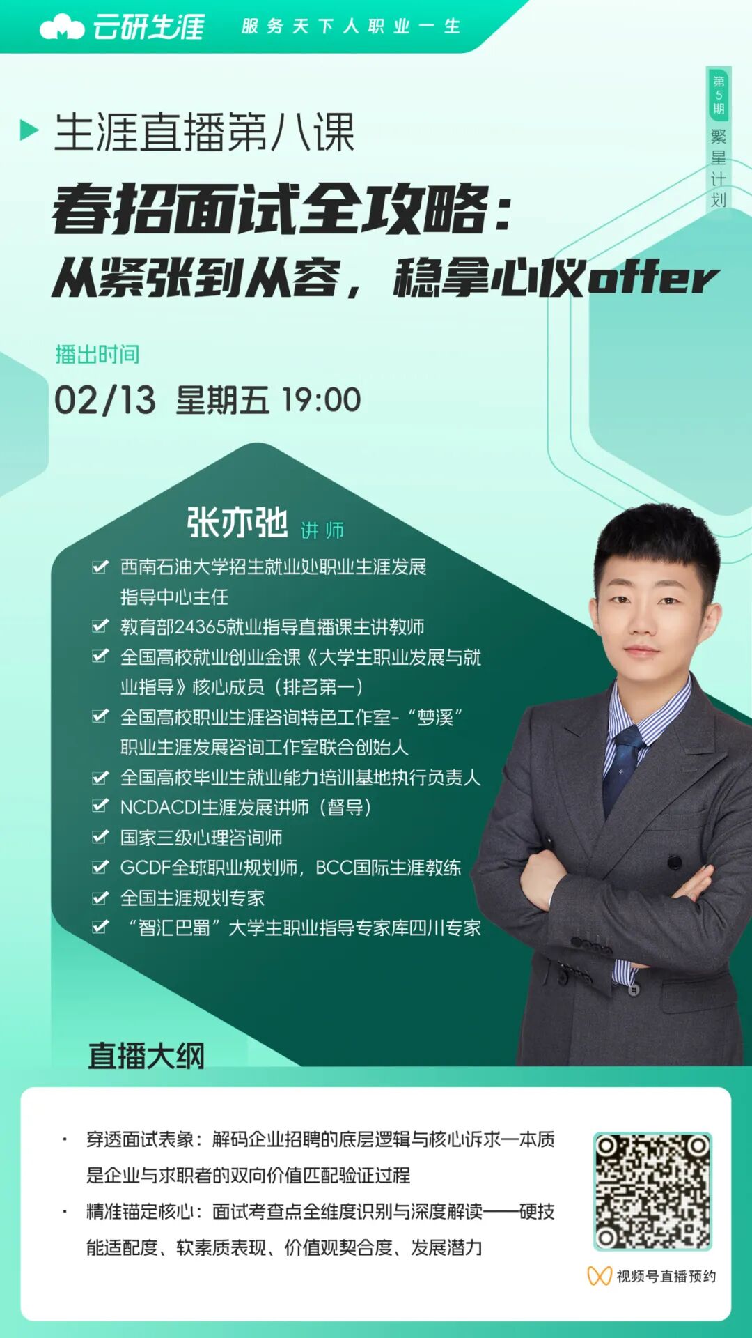 课程还融合朋辈经验分享与专业指导,以 “理论讲解 + 实战拆解 + 真实案例” 的三维教学模式,将生涯志趣探索、决策能力培养、职场竞争力提升落到实处。专业生涯指导师联袂行业资深导师倾力授课,全程干货满满、实操导向。锁定专属直播通道,抢先占位这场兼具理论深度与实操价值的生涯成长盛宴,为斩获理想 offer 蓄力,让生涯规划成为奔赴职业理想的坚实基石!